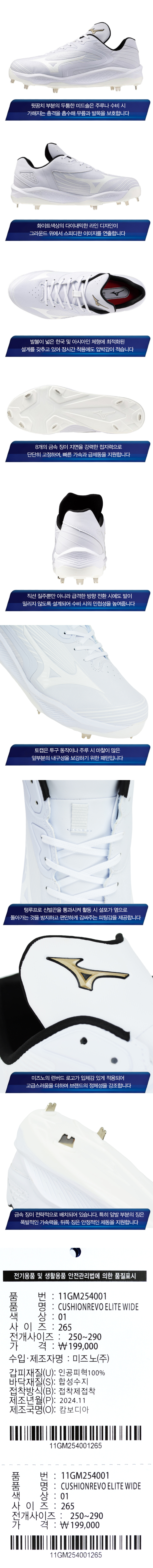 제품명 : MIZUNO엘리트일체형징야구화254001[흰]