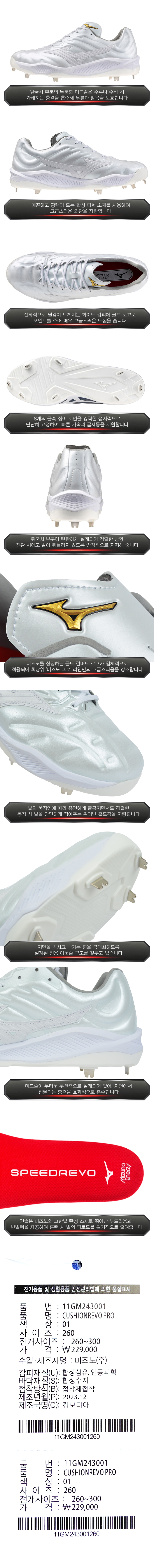 제품명 : MIZUNO프로일체형징야구화24300101[흰]
